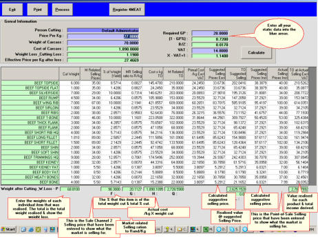 The idea to develop a Block Test software program was started many years ago.We developed a "Meat cutting schedule" to replace the old Meat Book for Mikes Kitchen (A Chain of restaurants in South Africa) in the late 1980's & 1990's.The customer would use this "Meat cutting schedule" to ensure that his person responsible for cutting up the Bulk Meat is cutting it to an optimal PROFIT level!For example - If my restaurant purchases 5kg Bulk Rump (Which is obviously Cheaper), I could Cut the following portions from it :500g Rump Selling @ R 95.00 per portion300g Rump Selling @ R 55.00 per portion200g Ladies Rump Selling @ R 45.00 per portion100g Kiddies Rump Selling @ R 25.00 per portionBurger Patties Selling @ R 25.00 per burgerEtcNow it obviously makes sense that you would maximize your profits if you can cut as many 500g portions out of your 5kg Bulk Rump as possible. So, If my "Block Person" can only cut 3 x 500g portions out of 5kg, either the meat is full of sinew - (bad quality) or he/she is not as efficient as they should be!The same applies to T-Bone, Chicken, Pork, Hind-quarter, Front Quarter etc etc......And, of course, the same concept applies to putting it all back together again. Example ; The lamb chops in my butchery is not moving or becoming a little stale...Why not use 4MEAT to cost the lamb chops with the basting & spices back into a new product called "Butchers own private stock"?Have fun & be creative!Remember it is still called "Profit on Sale"…