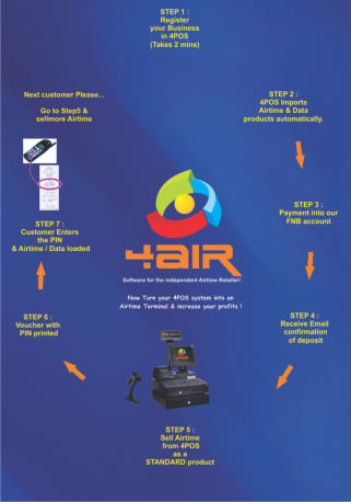Tired of using outdated & impossible to control airtime & data bundles? We have changed the mold……Simply register to sell airtime & data Bundles from your 4POS system, deposit some monies & start selling in minutes!.No approvals, no wait!You need Internet at all times! No Internet connection, no airtime sales! If you do not have a permanent internet connection, simply purchase a “Dongle” from your favourite company - MTN, Vodacom, Cell-C. Insert a sim-card with data, Plug in & start trading!1. Ensure you are running the latest 4POS software version.2. Register for Airtime under Utilities3. Deposit monies into the following account with ONLY your registered cell number - nothing else! No names, notes - just your cell number!Payments should only be made to the NEW 4AIR Bank account :Account name : Four AirBank : FNBBranch : 251141Account : 62432309559Please note - deposits of R101 or more only…Data Bundles, Unipin Electricity, Lotto, Sportbetting, TopTV now available!Payments made by EFT from FNB will be credited to your account automatically and immediately if your correct cell number is entered as the reference number. There is no need to email proof of payment. Payments from a different bank take longer.Cash deposits do have an additional fee. We have negotiated the best possible cash deposit fee!You will be notified via an sms of your new updated balance. 4. Now, you are ready to sell! From your 4POS Point of sale, either scan the Airtime item eg. V0002 (Vodacom R2.00) or search for it on your 4POS system. 5. You may sell other products or even more airtime. Finalise the sale when ready.6. 4POS will print your normal receipt when prompted as well as the Airtime voucher once complete.
